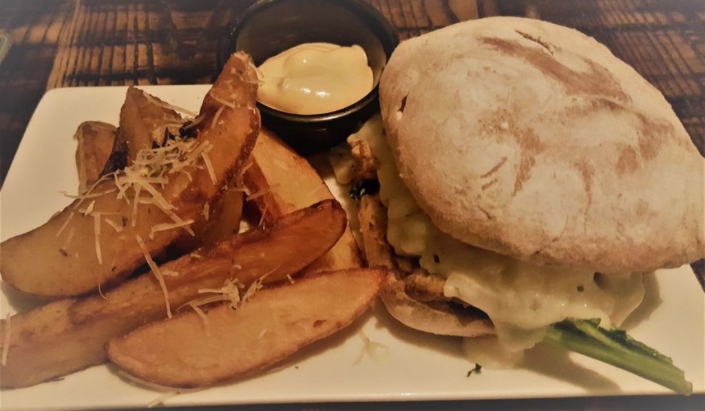 Sliced Pepper Seitan Steak, Bearnaise Sauce & Sautéed Kale. Served with Parmesan & Herb Chips & Sweet Chilli Mayo
