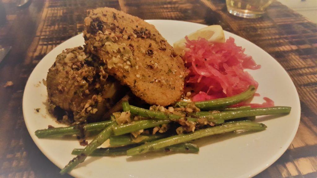 Crispy Breaded Seitan Escalope served with Hasselback Potatoes, Sautéed Green Beans & Sauerkraut Slaw