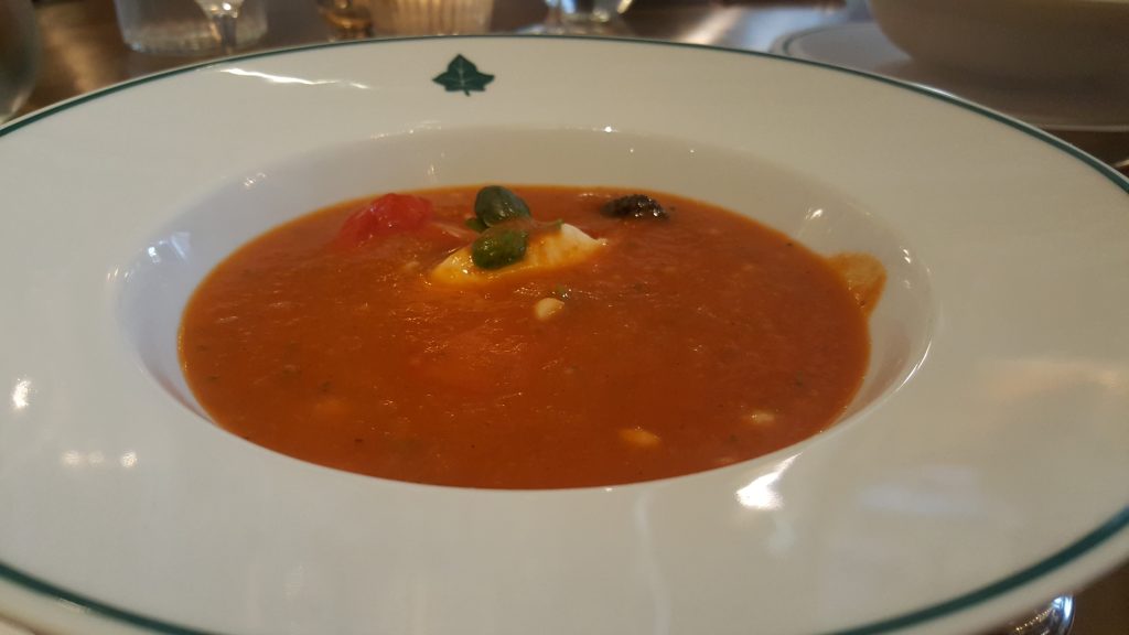 The food was wonderful and I have come to expect nothing less. The tomato soup was just perfect. It landed in front of us, with the fresh ingredients placed perfectly in the centre of the white bowl. The waiter poured the soup at the table, submerging the flavours, as the bowl filled with a vibrant red soup.
