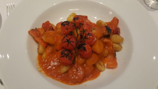 Potato Gnocchi with Roasted Pepper & Slow Cooked Cherry Tomato finished with Basil Dressing