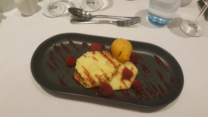 Chargrilled Pineapple with Mango & Passionfruit Sorbet finished with Raspberry Sauce