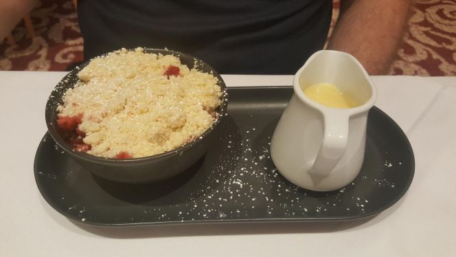 For dessert – I had the chargrilled pineapple and Bear has the crumble. His eyes lit up when he saw the crumble hit the table in front of him- and it did look extremely impressive. My pineapple was maybe a little bland in comparison to the successes of the starters and mains, but it was still a lovely and fresh way to finish the meal and cleanse my palette.