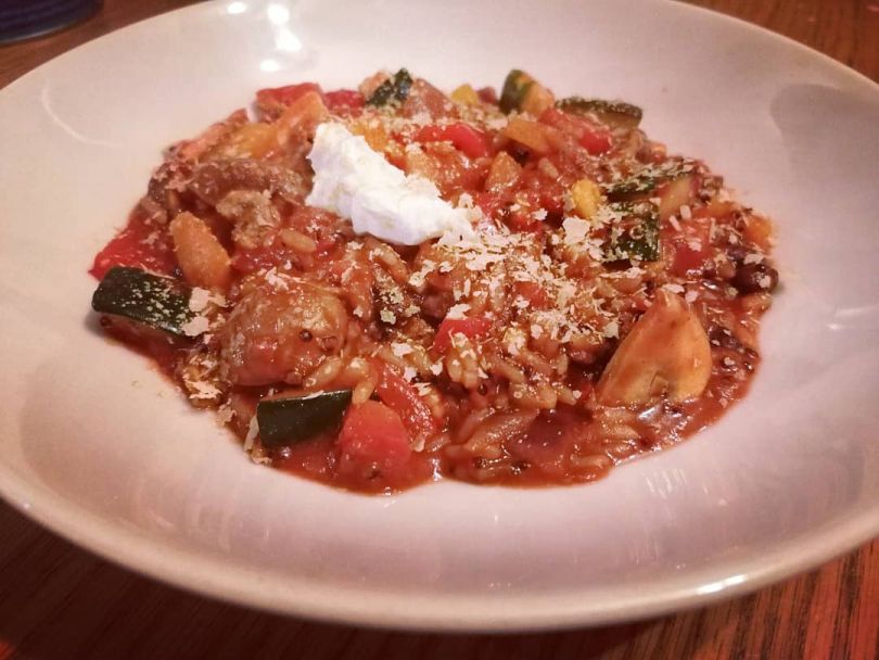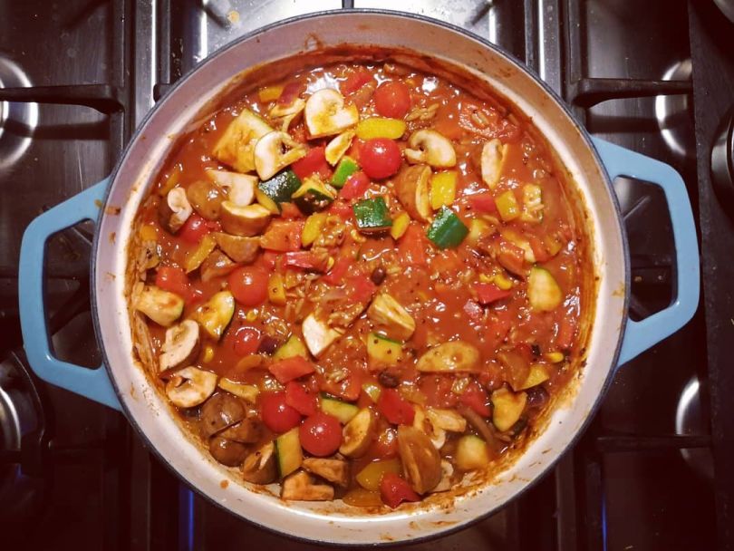 6) Pour over the white wine and the water, then add in a Knorr’s vegetable stock pot and allow to melt into the sauce. Give everything a good stir, cover and leave for an hour and a half, until the rice has absorbed all of the sauce.