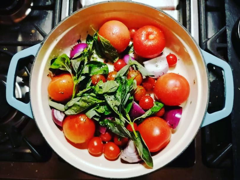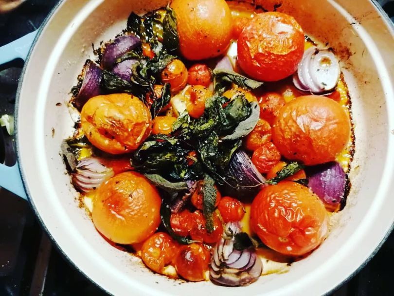2) Lay out the tomatoes in a large roasting tin. Add in the quartered red onions, garlic cloves, basil, sage, thyme and a generous sprinkle of sea salt. Now pour over the olive oil, submerging the tomatoes somewhat and place in the oven for 40 minutes.