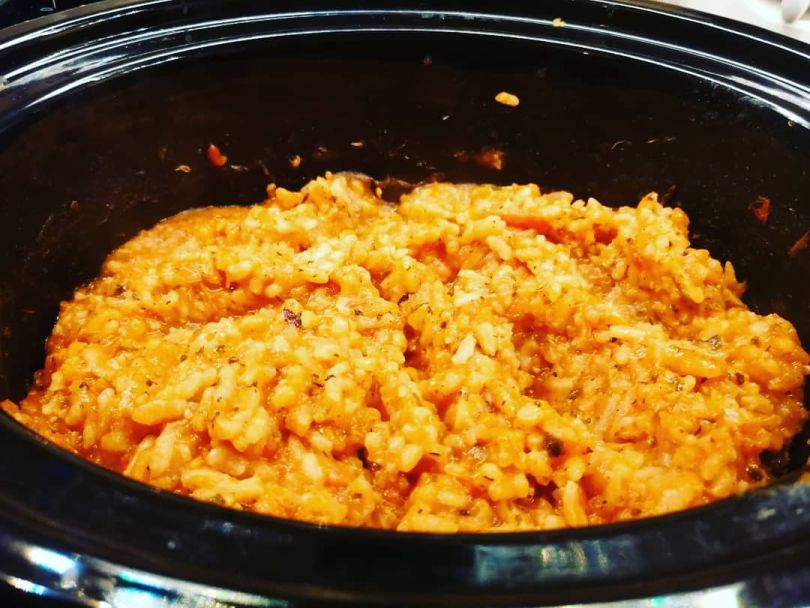 5) Pour this into your preheated heated slow cooker, add in the risotto rice and stir through.