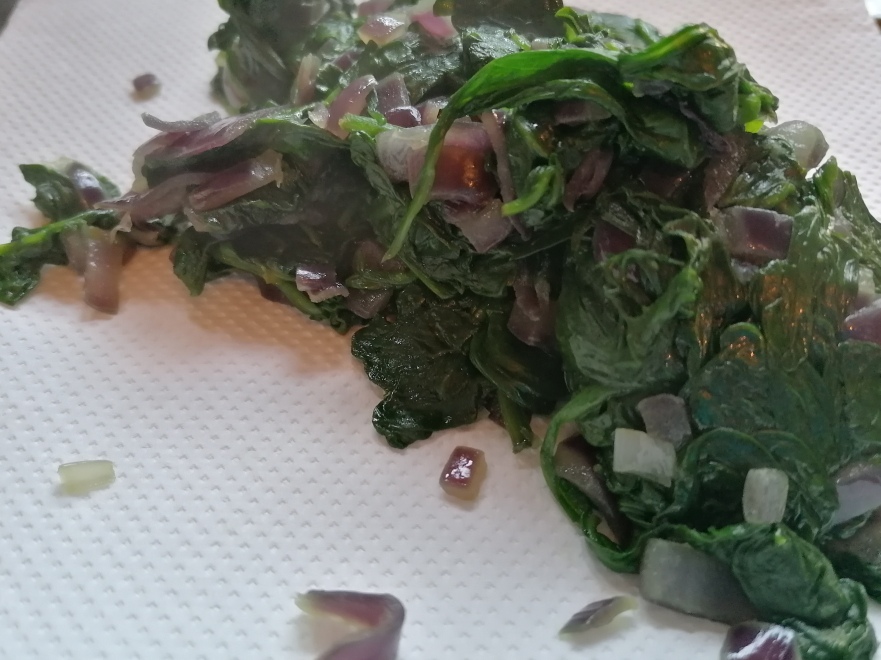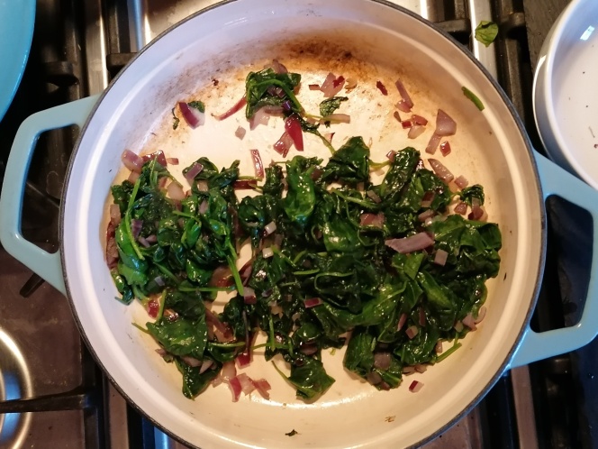 1) In a large pan, heat the oil. Add in the leek or scallions or onions, and sauté for about 3 minutes until lightly browned and softened. Add the spinach, and continue cooking until wilted, about 2 minutes (or simply thaw frozen spinach).