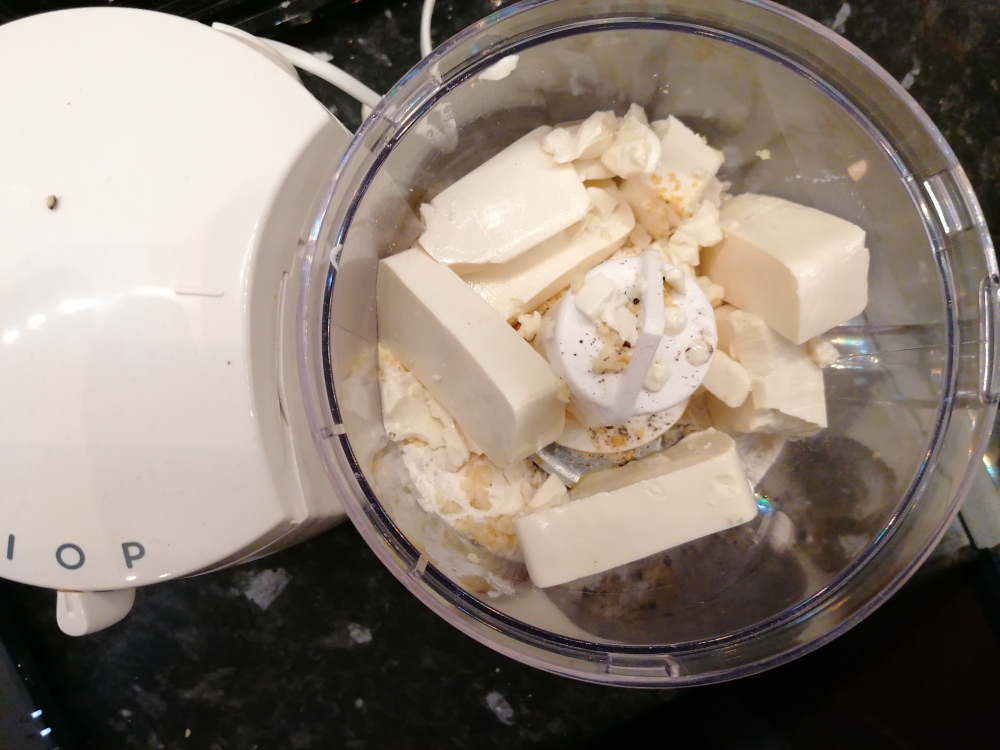 1) Blend the tofu, flour, nutritional yeast, and seasonings until smooth and creamy.