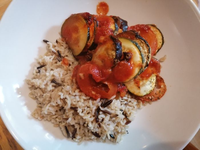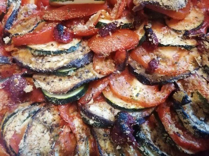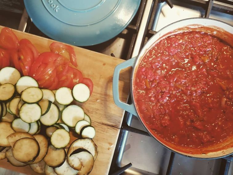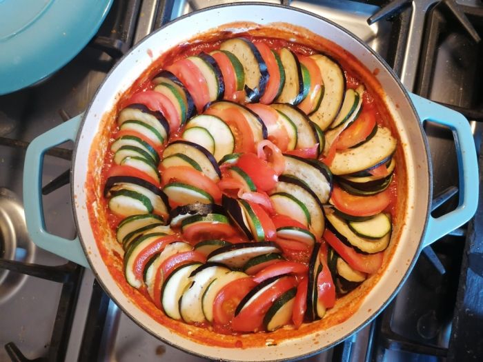 6) In a circular and repetitive pattern, lay a slice of tomato, courgette and aubergine upright on top of the sauce and swirl around the outside of the pan, and repeat to cover the middle.